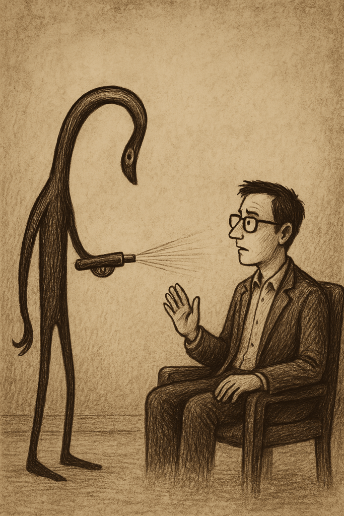 Първата ни среща в кабинета ми бе странна. Първо, дойде с двулитрова бутилка с бира. Второ, извади лазер, голям колкото бутилката и с него си запали цигарата, като остана и изгоряло петно върху стената. Казах му, че и двете неща са срещу правилата на психологичната работа. На емблематичния въпрос, какво мога да направя за него, отговори, че няма никакви очаквания, той добре разбира всичко понеже е математик, асистент в университета. После издекламира: „Физиката е приложна математика, химията е приложна физика, биологията, респективно медицината са приложна химия. Няма нищо друго.“ Опитах да говоря за самоубийството от морална и религиозна гледна точка. Пресече ме с думите, че не вярва в тези неща: „Нали вашият Фройд казва, че религията е илюзия, а моралът – невроза.“ Нямаше никакъв смисъл от философски спор.