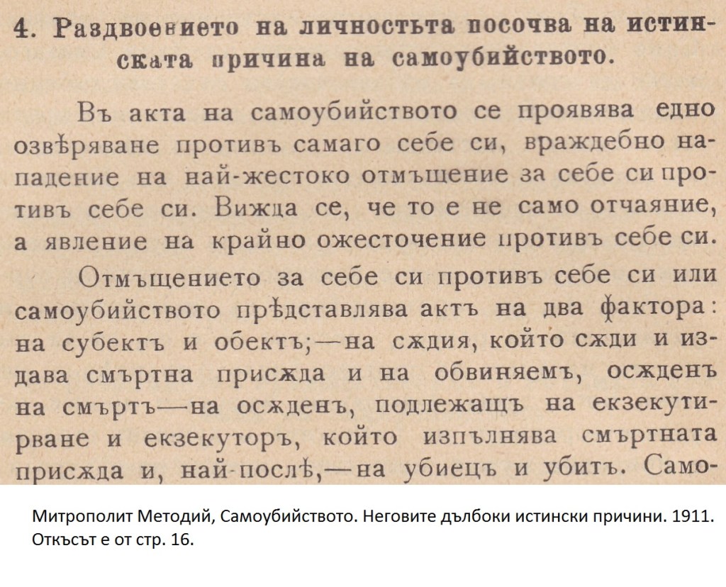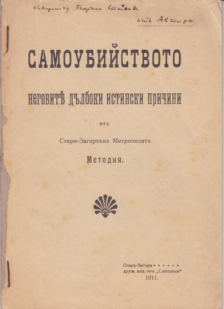 Нека да не сменяме европейските дрехи от началото на ХХ век, драги Гостенино. Да се пренесем, къде? Ами в България, в град Стара Загора. Там, моля, забележи, мой Гостенино, през 1911 г. отново във връзка със зачестилите самоубийства в Европа и в частност, България, Старозагорският митрополит Методий Кусев (род. 1838 г. – поч. 1922 г.) пише книгата: „Самоубийството. Неговите дълбоки истински причини.” Той прави анализ от християнска гледна точка на множеството случаи на самоубийства в България от началото на ХХ век. Факт е, че тази книга е написана няколко години преди работата на Фройд „Траур и меланхолия” и далеч преди Менингер да подчертае първостепенната важност за суицида на интрапсихичния конфликт пред външните събития.