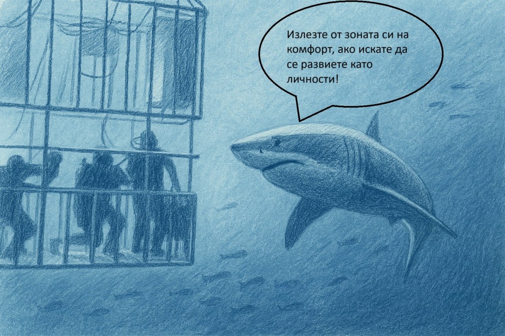Тук се сещам за една илюстративно точна и забавна карикатура. Погледни я. Гмуркачи седят в защитна подводна клетка, а отвън обикаля голяма акула, която – с ентусиазма на „лайф-коучърите” (т.нар. „треньори за живота“) им казва: „Няма да израстеш като личност, ако не излезеш от зоната си на комфорт!“. Иронията е прозрачна.